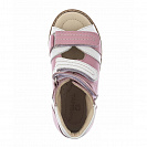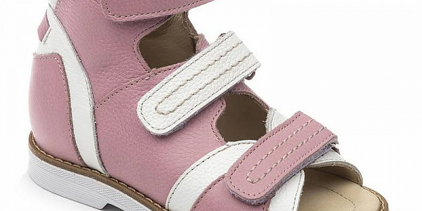 Эти ортопедические сандалии с открытым носом разработаны для коррекции стоп при вальгусной деформации, а также для профилактики плоскостопия. Применение данной модели рекомендовано детям при наличии сформировавшихся деформаций. Жесткий фиксирующий задник увеличенной высоты с удлиненным крылом изготовлен из двойного формованного термопласта. Возможность регулировки полноты тремя застежками велкро обеспечивают необходимую фиксацию голеностопа в правильном положении. Широкий, устойчивый каблук, специальной конфигурации - каблук Томаса. Подкладка из кожи теленка без швов. Кожа теленка обладает повышенной износостойкостью в сочетании с мягкостью и отличной способностью пропускать воздух для создания оптимального температурного режима (нога не потеет). Модель выполнена со сводоподдерживающим элементом. При применении данной обуви не требуется использование индивидуальных ортопедических стелек по назначению врача-ортопеда. Сандалии изготовлены из гладкой кожи розового цвета с белыми деталями.